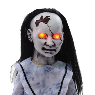 This scary little broken doll is just sitting out in the graveyard on her blanky but don’t get to close as she may come to life and get you! Injection-molded mechanism of a lunging Dolly character featuring fabric costume Printed soiled blanket Soft-PVC head with long stringy hair, Soft-PVC hands and feet. Red LED eyes & sounds. Optional power: Battery-operated or UL adapter plug, Choose from try-me foot pad, IR motion sensor. Easy to assemble. When activated she will sing an eerie lullaby then lunge forward with blood curdling screams and giggles!! Uses 4 AA batteries (not included).
