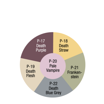 With shades like Frankenstein, Pale Vampire, Death Blue Grey, and Death Flesh, this wheel is one of our most universally applicable wheels when it comes to character and horror makeup. The Death Wheel is a masterful collection of colors useful to every theatrical, stage, special effects, cosplay, and character makeup artist.
