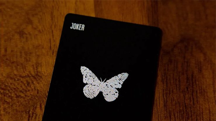 This unique Butterfly deck features a blacked-out design with a black border. The backs and faces use no color. Instead, they are covered with a holographic foil! To complete the whole aesthetic, the cards have matte black gilding. The gilding helps the backs transit to the faces flawlessly and makes the holographic foil stand out.